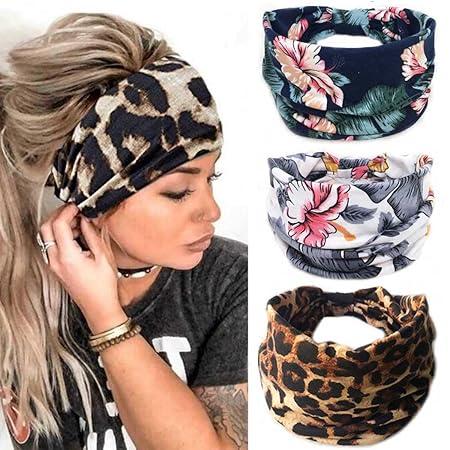 Ongebruikt, 3 banden, ok. Fashband Boho brede haarband luipaard tulband hoofdband bloem bedrukte hoofddoek elastische yoga hoofdbanden haaraccessoires voor vrouwen en meisjes (pak van 3), B091JR8R6Q