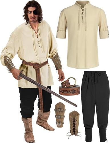 Ongebruikt, ok. Geplaimir Middeleeuws kostuum voor heren, Victoriaanse piraten, steampunk, cosplay, veterhemd, top met accessoires, Vikingbroek, mannen, armspalken, PU-leder, O-ring, riem, B0CMV49SLC