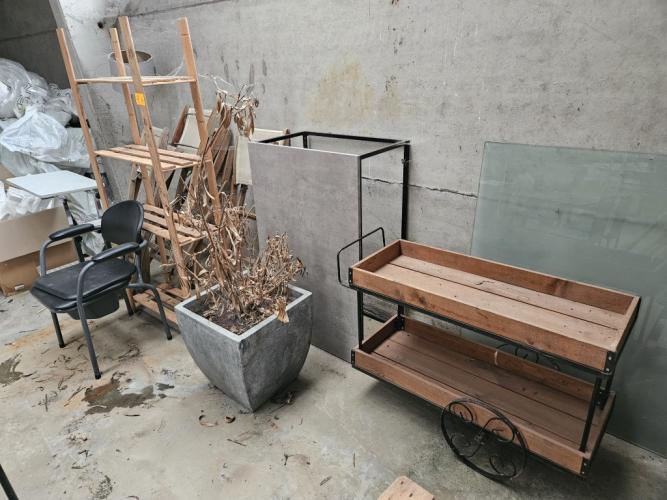 oa: betonlook salontfael, verrijdbare kar, wandrek, barstoellen ,.. ( alles moet mee)