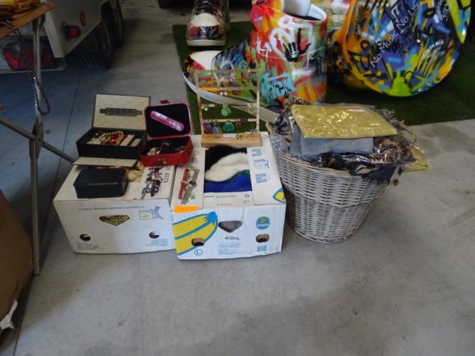oa. Uurwerken, oorbellen, kettingen, hoofddeksels, sjaals, rieten mand,...
