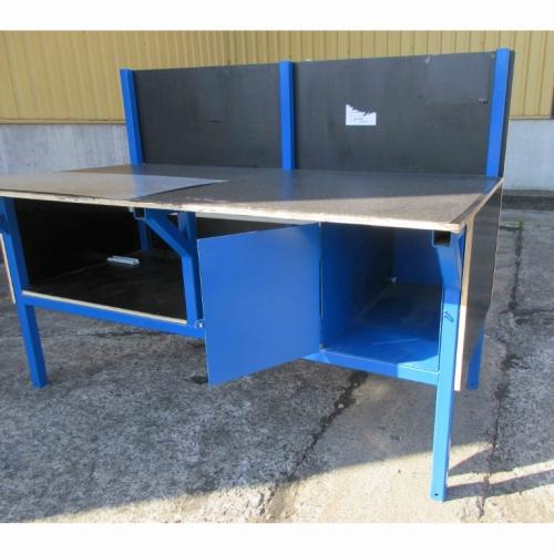 Afmetingen: L 2000mm , D 1050mm - hoogte regelbaar door verstelbare poten -Max hoogte werkblad 1000mm - Kastje: B 400mm - H 450mm - Materiaal: stalen profielen 2,5mm en betonplex platen dikte 18mm