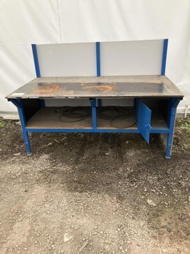 Afmetingen: L 2000mm , D 1050mm - hoogte regelbaar door verstelbare poten -Max hoogte werkblad 1000mm - Kastje: B 400mm - H 450mm - Materiaal: stalen profielen 2,5mm en betonplex platen dikte 18mm