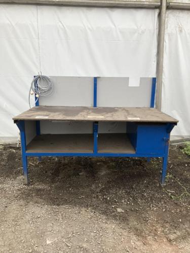 Afmetingen: L 2000mm , D 1050mm - hoogte regelbaar door verstelbare poten -Max hoogte werkblad 1000mm - Kastje: B 400mm - H 450mm - Materiaal: stalen profielen 2,5mm en betonplex platen dikte 18mm