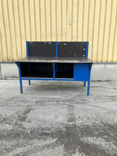 Afmetingen: L 2000mm , D 1050mm - hoogte regelbaar door verstelbare poten -Max hoogte werkblad 1000mm - Kastje: B 400mm - H 450mm - Materiaal: stalen profielen 2,5mm en betonplex platen dikte 18mm