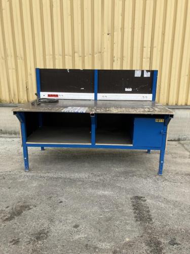 Afmetingen: L 2000mm , D 1050mm - hoogte regelbaar door verstelbare poten -Max hoogte werkblad 1000mm - Kastje: B 400mm - H 450mm - Materiaal: stalen profielen 2,5mm en betonplex platen dikte 18mm - voorzien van stopcontacten en doorvoergaten voor elektrische kabels