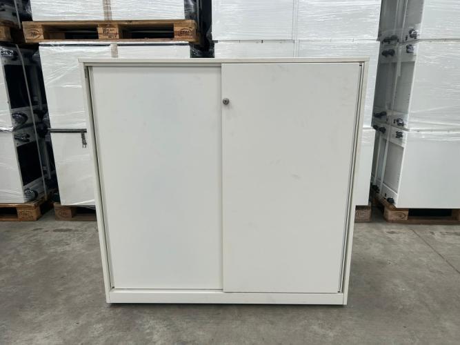 1x AHREND Halfh Schuifdeurkast H120xB120xD45 - Wit/Metaal, Geen sleutel (V0413), met enkele gebruikssporen