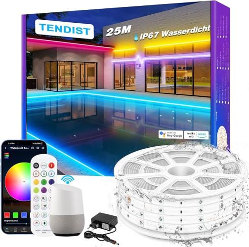 Minieme gebruikssporen, getest en werkend, bakje niet origineel, ok, TENDIST 25 m wifi RGB ledstrip, waterdicht, IP67 ledstrip voor buiten, 24 V, outdoor ledstrip, muzieksynchronisatie, compatibel met Alexa, led-strip voor paviljoen, pergola, buitenverlichting,B0D637KLPL