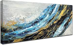 Ongeopend, Canvas muurkunst met houten lijst, goudkleurig, marineblauw, zeegolf schilderij op canvas, abstracte oceaanaquarel, foto's voor woonkamer, slaapkamer, thuiskantoor, wanddecoratie, 50 x 120 cm, B0D56SH5PC