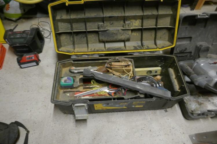 2 gereedschapskoffers met inhoud : waterpas - rolmeter - spanvijzen - hamers - handzagen - verlengkabels - luchtdrukslangen - enz…