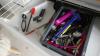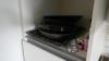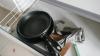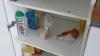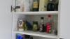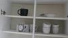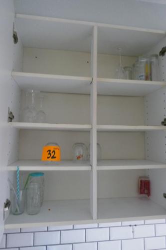 Inhoud keukenkasten : glazen - borden - tassen - kist met diverse munten - keukenmateriaal - steelpannen - diverse kruiden - enz…