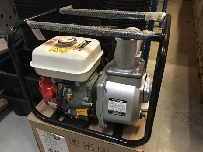 Aanzuig- en persopening diameter 80mm (3"), 60m³ per uur, 4-takt, 196cc. Met diverse aansluitstukken.Ongebruikt in verpakking