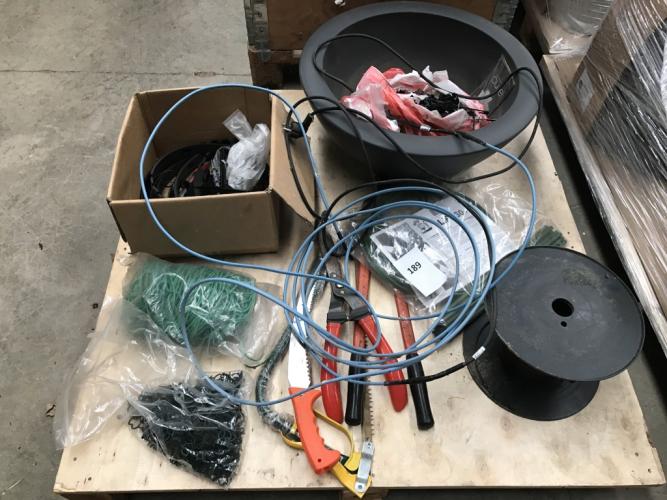 O.a. diverse gereedschappen, 2 warmtekabels, binddraad, boombinders, plantenpot Elho,..