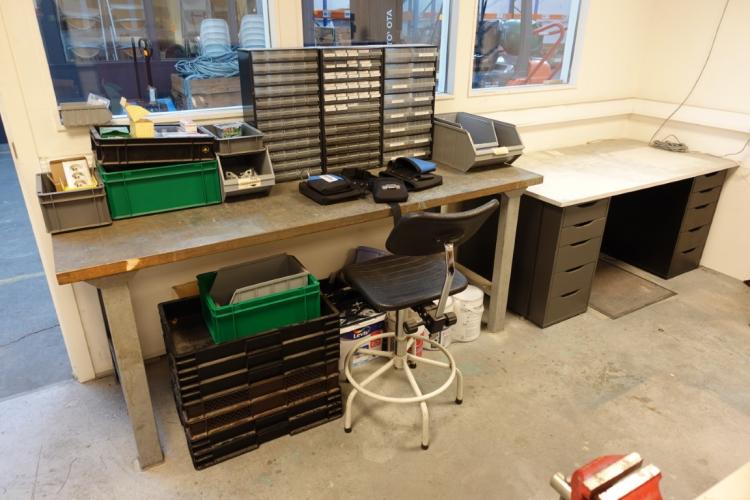 alles dient meegenomen te worden, oa: tafels, stoelen, schragen, printers, metaal, kasten, werkbank met toebehoren (excl. lot 12,65,66)