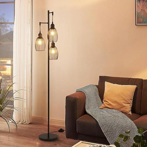 Ongeopend, in seal, Kaixunl Zwarte staande lamp, ijzeren lamp, retro staande lampen, vintage staande lamp in de vorm van een vogelkooi, geschikt voor gebruik in woonkamer, slaapkamer, drie lampenkoppen, E27, H160cm, B0D8NS7VZ3