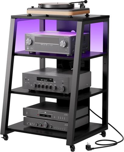 Ongebruikt, getest en werkend, volledig, ok, Lifewit 4-traps audio-media-standaard met stekkerdozen en ledverlichting, hout en staal, tafel voor platenspeler en stereo-installaties en compacte installatie, zwart, B0DWZTN2GD