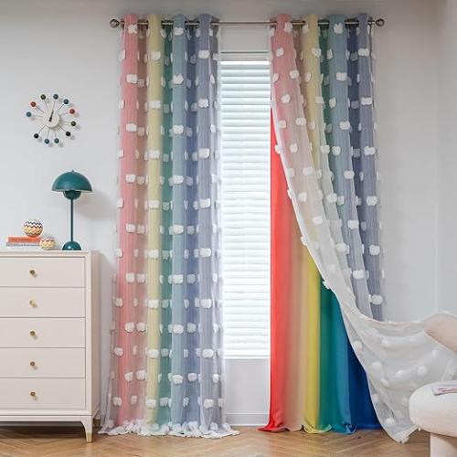 Ongeopend, ok, MYSKY HOME Kinderkamergordijnen met ringen, verduisteringsgordijn, ondoorzichtig, voile dubbellaags gordijn, gordijn met inslagringen, set van 2, H 213 x B 132 cm, regenboog, B0D8VYWGG9