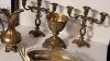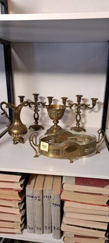 messing art nouveau tafelkom, 2 kandelaars, kelk en vaas