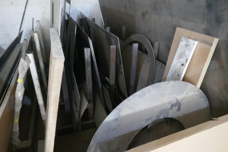 Stalen platen rek met als inhoud diverse stukken staal
