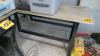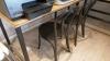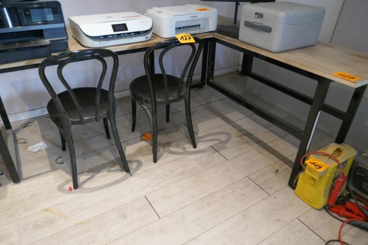 Bureautafel hoekvormig op zwartmetalen onderstel en houten bovenblad + 2 houten vintage stoelen