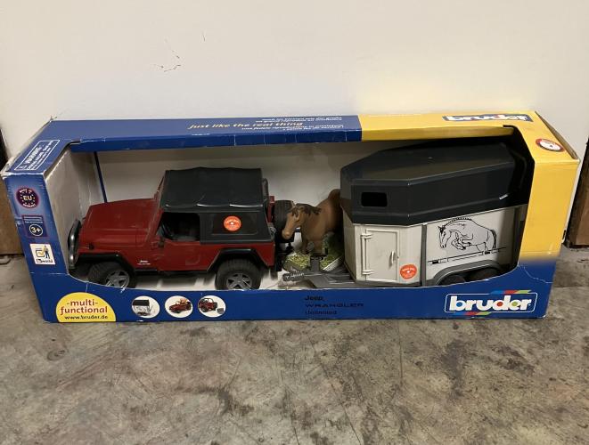 Jeep Wrangler met paardentrailer en paard Bruder 02921