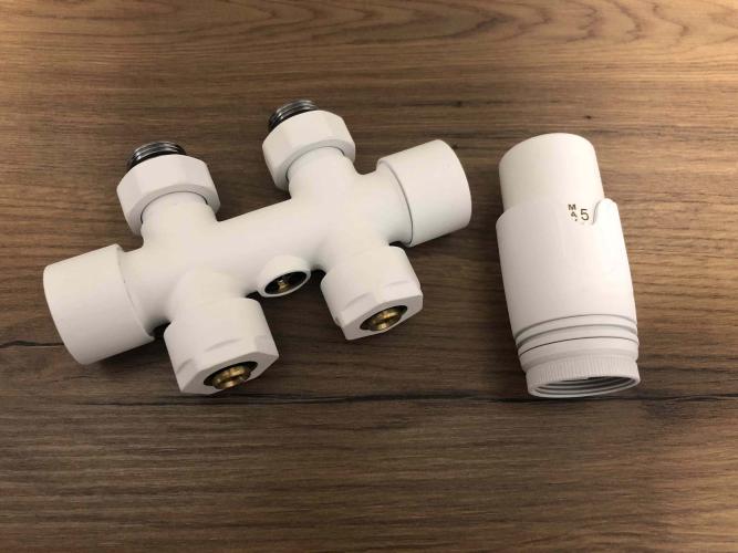 1 x Thermostatische design kraanset met middenaansluiting uit vloer (recht) - Omkeerbaar - Kleur wit- Met 16mm knelset - Voor badkamerradiatoren en design radiatoren - DW-1