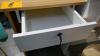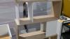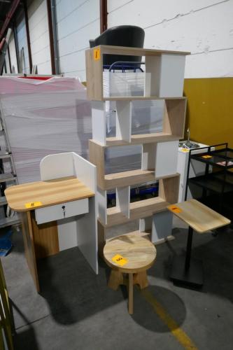 Diverse meubelstukken : vakkenkast - receptietafel - houten zitkrukje - verrijdbaar tafeltje