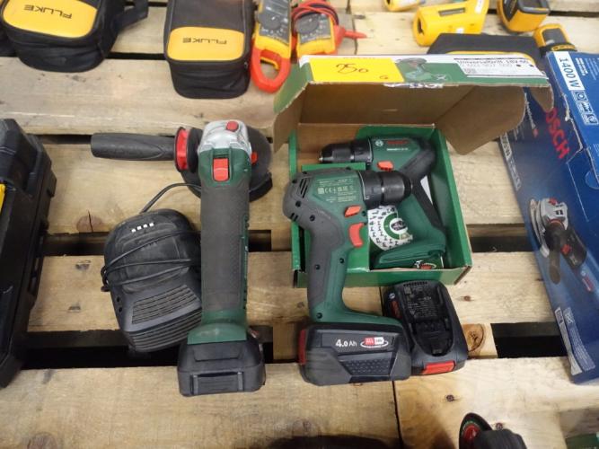 haakse slijper en 2x boormachine, vv 3x accu en lader