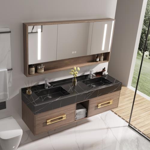 Badkamermeubel 2-persoons - 150 cm - Hout decor met zwarte marmeren wasbak - Incl. kranen