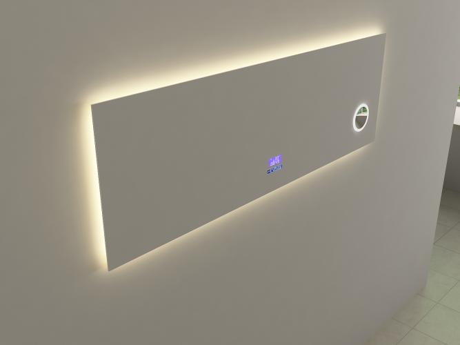 Voorzien van: Touch bediening via digitaal display – LED verlichting in 3 kleuren, dimbaar – Bluetooth & speakers – Digitale klok – Digitale temperatuurmeter – 220 volt aansluiting – Anti-fog technologie door verwarming in de spiegel – Vergrootglas (vergroot 3x) in de spiegel Ø10 cm - Kopervrije spiegel - 1,5mm explosieveilige laag aan de achterkant.