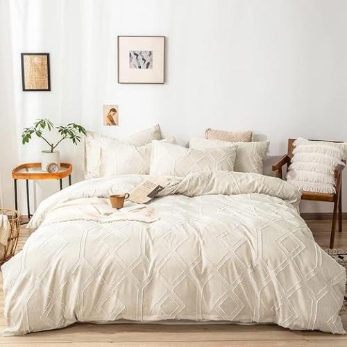 Lichte gebruikssporen, ok, originele verpakking ontbreekt, Freyamy Beddengoed, 135 x 200 cm, 4-delig getuft, boho, geometrische beddengoedset, beige, borduurwerk, modern, chic, microvezel, 2 dekbedovertrekken met ritssluiting en 2 kussenslopen 80 x 80 cm, B0DKT5XLNL