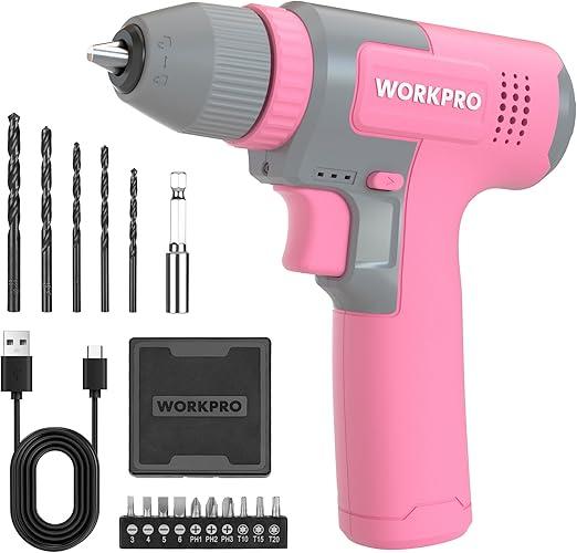 Ongebruikt, getest en werkend, volledig, ok, WORKPRO 8V Accuboormachine Set, Accuboormachine, 2000 mAh Accu Boormachine, 12 Nm Koppel, 10mm Boorkop, LED-Licht, Compleet Accessoireset, Voor Huishoudreparaties & DIY, Roze & Grijs, B0D97N6XWK