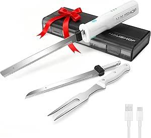 Ongebruikt, getest en werkend, volledig, ok, HAUSHOF elektrische messenset 8V, snoerloos keukenmes met roestvrijstalen messen, 2000 mAh batterij voor nauwkeurig snijden van brood, vlees en kaas, met opbergdoos, wit, B0D21VSTS4