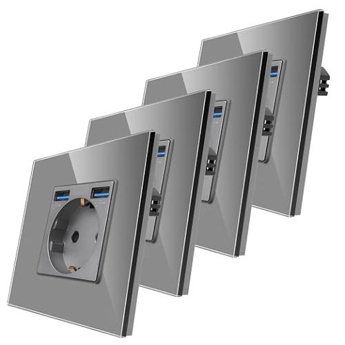 Ongeopend, ok, licht beschadigde verpakking, CnBingo Glazen schuko-contactdoos met USB-poorten 2,1 Amp totaal, design geaard stopcontact, enkel, met glazen frame, inbouwstopcontact, grijs, 4 stuks, B0BNN6SKPQ