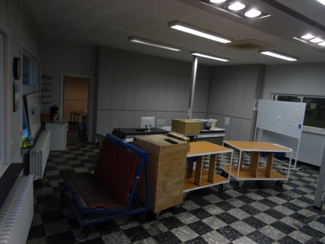 2x verrijdbare metalen werktafel, 2x metalen bureau, koelkast, notitieborden, houten bureau, ... (alles moet mee)
