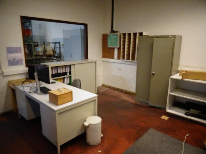 metalen bureau, metalen kast, computer, scherm, tafel, ... (alles moet mee)