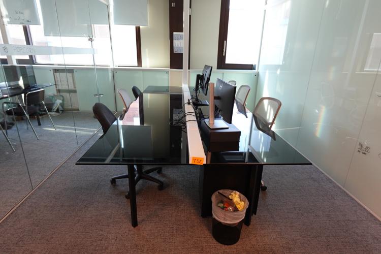 Bureautafel 3370x1570x780 mm met glazen blad en alu onderstel, alu bureaukastje, 6x bureaustoel, 2x PC scherm, glazen opzet, +++ alles moet mee