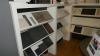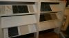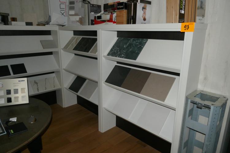 2 houten presentatiekasten witte kleur + vintage ronde tafel