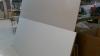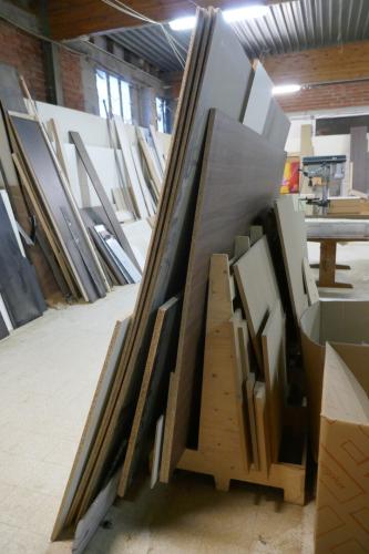 Houten bok met volle en resten van meubelplaten, diverse kleuren + inhoud rek : volle en resten van meubelplaten