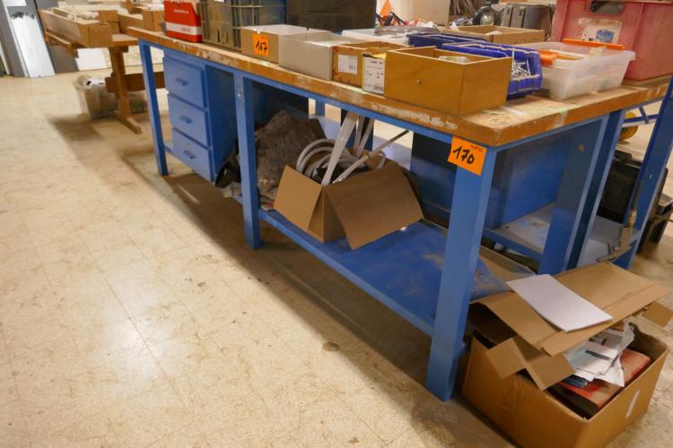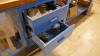 Blauwmetalen werkbank met 3 schuifladen en bodemschap