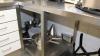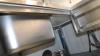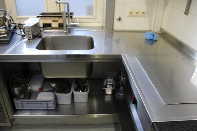 RVS keukenelement - werkblad, inclusief hoekelement met bain marie (niet-werkend), kraan en spoelbak, te demonteren. Werkblad lengte 3m75, diepte 70cm. Hoekelement bain marie/ elektriciteit te zekeren. 1m40x60cm. Hoogte 85 cm. Zonder inhoud. Zelf te demonteren.