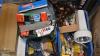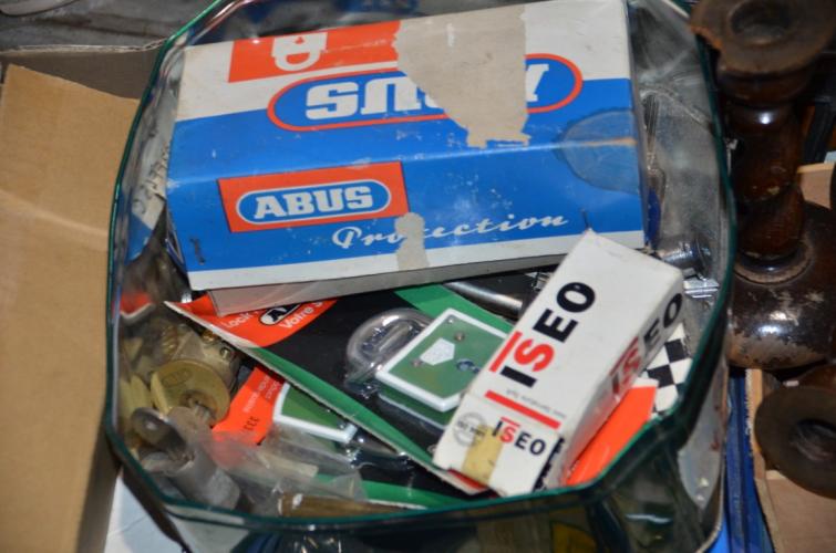 2x magazijnbak met diverse werkmateriaal + metalen doos met sloten