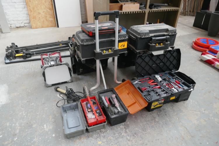 Divers werkgereedschap : gereedschapskisten met inhoud - werfverlichting - veiligheidsschoenen - enz…