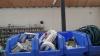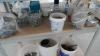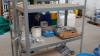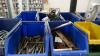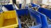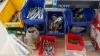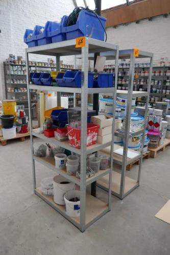 2 metalen rekken met houten legborden met inhoud : Reeks rangeerbakken met bevestigingsmateriaal en gereedschap