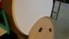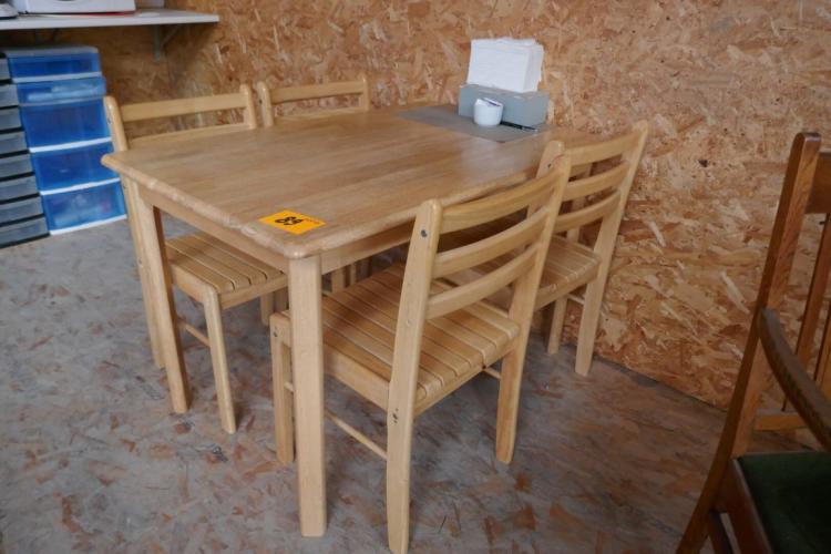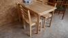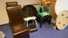 Keukentafel met 4 stoelen - 2 eetkamerstoelen - kinderstoeltje - bijzettafeltje - 2 partytafels - zitkrukje - plastieken tuintafel - 2 houtenkasten met elk 3 laden - commodekast zonder inhoud