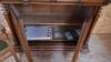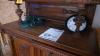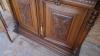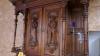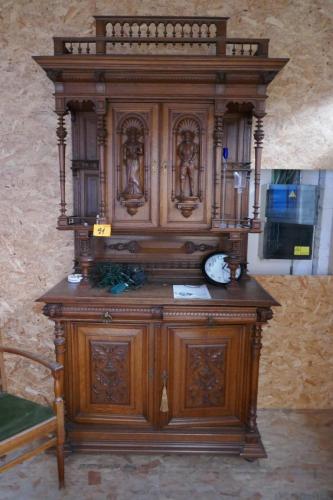 Antieken Mechelse buffetkast met houtsnijwerk (middeleeuwse figuren) + antieken houten stoel met zitting in groene stof