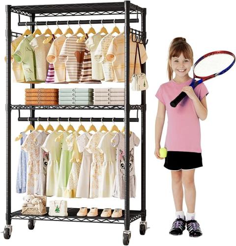 Ongeopend, ok, Kledingrek voor kinder-, baby-, studenten- en kinderkamers, draagbaar metalen kledingrek met 3 lagen en 2 ophangstangen, B0DJYYFJJK