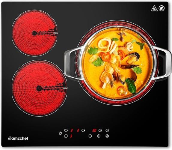 Ongebruikt, getest en werkend, volledig, ok, AMZCHEF Keramische kookplaat, 3 pits, kookplaat met 3 kookplaten, 5400 W, met 9 standen, groot oppervlak van 2400 W, automatische uitschakeling, timer, veiligheidsvergrendeling, zwart, B0D17R42ZD
