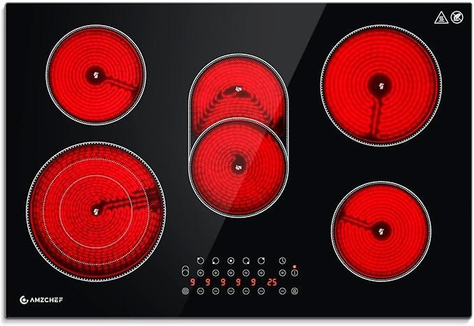 Ongebruikt, getest en werkend, volledig, ok, AMZCHEF Glaskeramische Kookplaat (5 Zones), Inbouw Keramische Kookplaat 77 cm met Ovale Zone en Drievoudige Zone, 9 Vermogensniveaus, Timer, Veiligheidsslot, Oververhittingsbeveiliging, 8500 W, B0F5WTJMN8