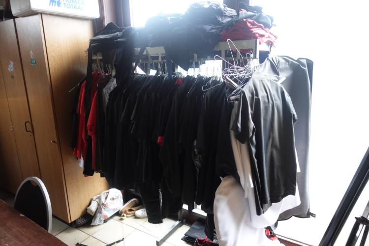 oa: kleren , trapladder , barstoel , houten tafels , stoel, presentatiescherm