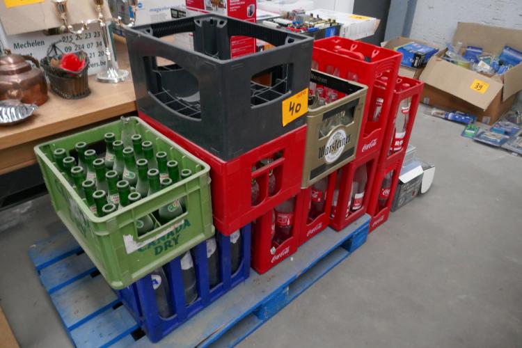 Houten palet + bakken leeggoed - ongeveer 14 stuks